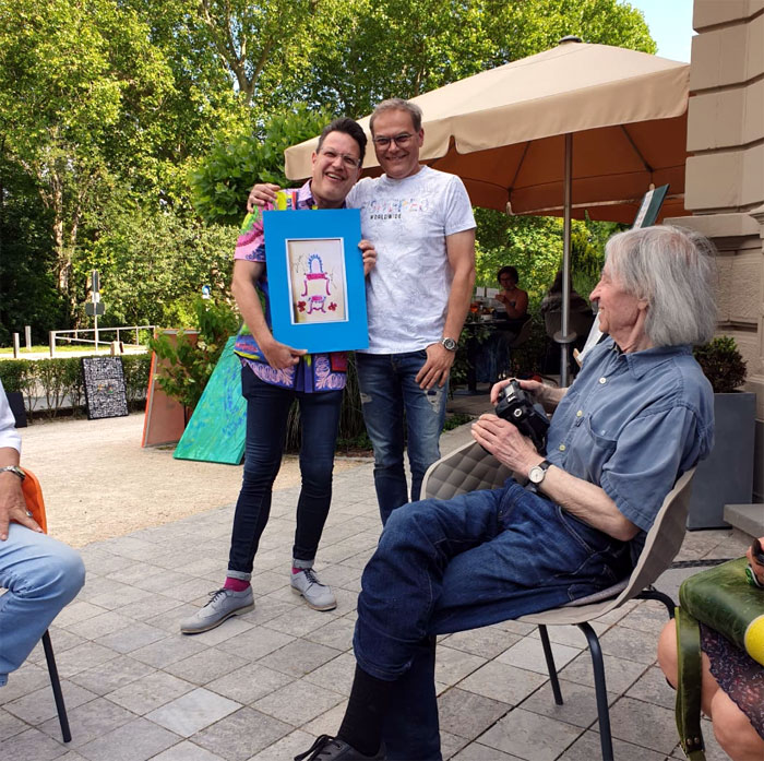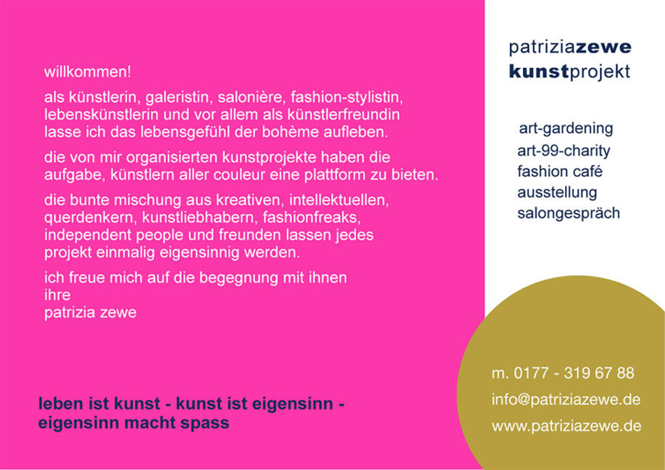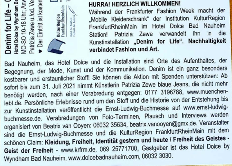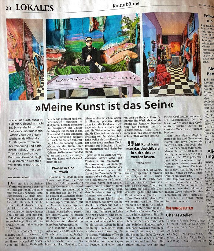 26. dezember 2019Vorschau 2020 ! Eine herzliche Einladung zur Ernst-Ludwig-Buchmesse 2020 in Bad Nauheim ! Ich freue mich, meine Installation „ i`m an artist, this means, i live in a magic world with unrealistic expectation „ auf der Bad Nauheimer Ernst – Ludwig - Buchmesse auszustellen. Gemäß meines Credos: Leben ist Kunst – Kunst ist Eigensinn – Eigensinn macht Spass Übersicht der teilnehmenden Künstler Die Buchmesse findet am 04.+05.04.2020 statt und ist je von 10-18 Uhr bei freiem Eintritt geöffnet. Ort ist das Max-Planck- und W.G.Kerckhoff-Institut, Parkstraße 1 in Bad Nauheim. Beide Säulenportale werden geöffnet sein. In den historischen Räumlichkeiten treffen ausgewählte Kunst- und Kulturanbieter auf Endverbraucher und Fachpublikum. Die 60 Aussteller sind unter anderem Verleger, Autoren, Illustratoren, Buchhändler, Blogger und Künstler. Eine Kunstgalerie, 10 Workshops, 40 Lesungen und eine Präsentationen zum Thema Kleidung, Freiheit, Identität, sowie drei Abendveranstaltungen (03., 04., 05.04.) sind ein Ereignis. Die Bad Nauheimer Buchmesse fördert erneut Kunst und Kultur, sowie die sorgfältige Kommunikation auf Augenhöhe, ganz im Sinne von Ernst Ludwig: „Mein Hessenland blühe und mit ihm die Kunst.“ Der Standort der Buchmesse, das Max-Planck-Forschungsinstitut, ist, wie die Gebäude vor über 100 Jahren von Ernst Ludwig, ein Geschenk an die Stadt Bad Nauheim, diesmal von Ehepaar Kerckhoff Ende der 1920er Jahre mit dem Zweck, das Wissen um unsere Gesundheit voranzubringen. Großherzog Ernst Ludwig von Hessen und bei Rhein ist Namensgeber der Buchmesse und Vorbild: Er hat nicht nur die Künstlerkolonie auf der Mathildenhöhe in Darmstadt initiiert, sondern wir haben ihm in Bad Nauheim auch unsere Jugendstilanlagen zu verdanken. Grund dafür waren die noch heute wirksamen Heilquellen. Die Zarenfamilie, Einstein, Sisi, aber auch später Elvis Presley und viele andere Berühmtheiten residierten hier bei uns in Bad Nauheim. Ernst Ludwig förderte nicht nur die Architektur. Er malte, dichtete, komponierte, musizierte und schrieb Theaterstücke von hoher Qualität. Mit ihm sind wir in bester Gesellschaft. 2020, das Jahr der 4. Ernst-Ludwig-Buchmesse, ist das Jahr, in dem Darmstadt die Anerkennung der Künstlerkolonie Ernst Ludwigs auf der Mathildenhöhe erwartet. Ich freue mich auf Ihren Besuch! ![]() ![]() ![]() |