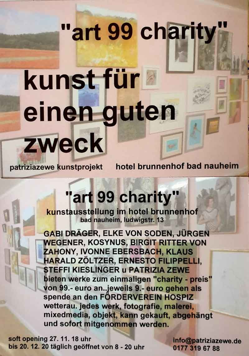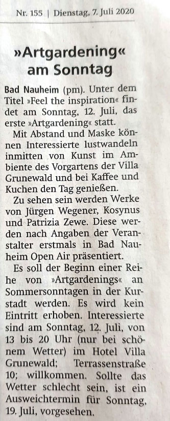 | 9. juli 2020 Unsere Hinterhofgalerie öffnet zum artweekend am Freitag , 31. 7 . 2020 ab 14 uhr … sa / so von 14 – 19 uhr HINTERHOFGALERIE im „ creme de la creme „ Fussgängerzone in Bad Nauheim Freitagabend um 18 uhr spielen die „ singing sixties „…. Herzlich Willkommen ! Art will save the world ----Art will save our soul ! Ausgestellt werden Objekte , Mixedmedia, Fotografie u Malerei von kosynus, jürgen wegener u patrizia zewe ![]() ![]() ![]() ![]() |