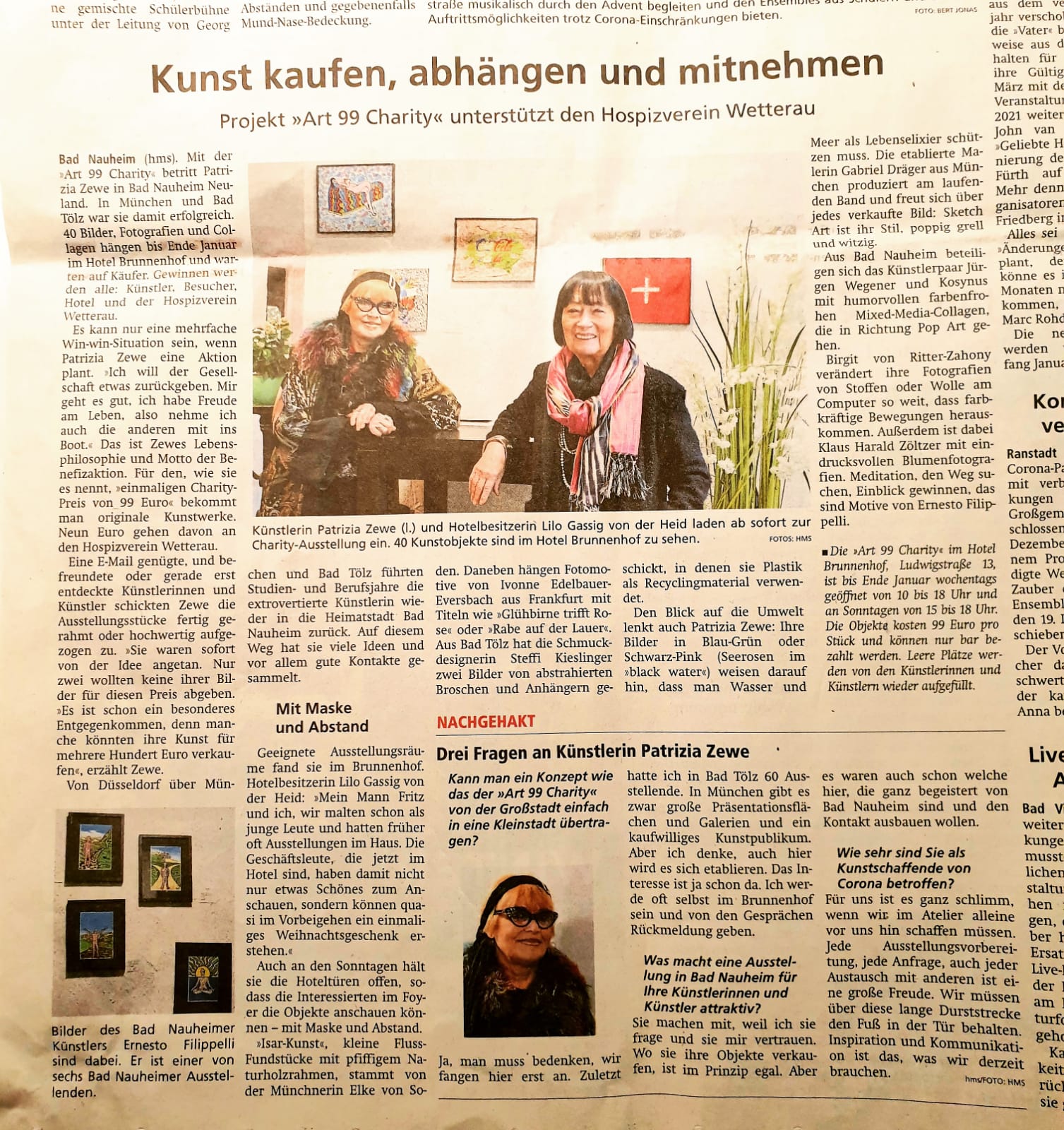 26. dezember 2019Vorschau 2020 ! Eine herzliche Einladung zur Ernst-Ludwig-Buchmesse 2020 in Bad Nauheim ! Ich freue mich, meine Installation „ i`m an artist, this means, i live in a magic world with unrealistic expectation „ auf der Bad Nauheimer Ernst – Ludwig - Buchmesse auszustellen. Gemäß meines Credos: Leben ist Kunst – Kunst ist Eigensinn – Eigensinn macht Spass Übersicht der teilnehmenden Künstler Die Buchmesse findet am 04.+05.04.2020 statt und ist je von 10-18 Uhr bei freiem Eintritt geöffnet. Ort ist das Max-Planck- und W.G.Kerckhoff-Institut, Parkstraße 1 in Bad Nauheim. Beide Säulenportale werden geöffnet sein. In den historischen Räumlichkeiten treffen ausgewählte Kunst- und Kulturanbieter auf Endverbraucher und Fachpublikum. Die 60 Aussteller sind unter anderem Verleger, Autoren, Illustratoren, Buchhändler, Blogger und Künstler. Eine Kunstgalerie, 10 Workshops, 40 Lesungen und eine Präsentationen zum Thema Kleidung, Freiheit, Identität, sowie drei Abendveranstaltungen (03., 04., 05.04.) sind ein Ereignis. Die Bad Nauheimer Buchmesse fördert erneut Kunst und Kultur, sowie die sorgfältige Kommunikation auf Augenhöhe, ganz im Sinne von Ernst Ludwig: „Mein Hessenland blühe und mit ihm die Kunst.“ Der Standort der Buchmesse, das Max-Planck-Forschungsinstitut, ist, wie die Gebäude vor über 100 Jahren von Ernst Ludwig, ein Geschenk an die Stadt Bad Nauheim, diesmal von Ehepaar Kerckhoff Ende der 1920er Jahre mit dem Zweck, das Wissen um unsere Gesundheit voranzubringen. Großherzog Ernst Ludwig von Hessen und bei Rhein ist Namensgeber der Buchmesse und Vorbild: Er hat nicht nur die Künstlerkolonie auf der Mathildenhöhe in Darmstadt initiiert, sondern wir haben ihm in Bad Nauheim auch unsere Jugendstilanlagen zu verdanken. Grund dafür waren die noch heute wirksamen Heilquellen. Die Zarenfamilie, Einstein, Sisi, aber auch später Elvis Presley und viele andere Berühmtheiten residierten hier bei uns in Bad Nauheim. Ernst Ludwig förderte nicht nur die Architektur. Er malte, dichtete, komponierte, musizierte und schrieb Theaterstücke von hoher Qualität. Mit ihm sind wir in bester Gesellschaft. 2020, das Jahr der 4. Ernst-Ludwig-Buchmesse, ist das Jahr, in dem Darmstadt die Anerkennung der Künstlerkolonie Ernst Ludwigs auf der Mathildenhöhe erwartet. Ich freue mich auf Ihren Besuch! ![]() ![]() ![]() |