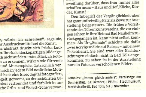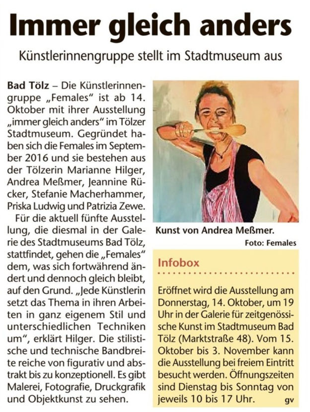 | 21. august 2021 Neue Ausstellung der FEMALES – Ich bin Mitglied der Females, wir freuen uns, Sie zu unserer Ausstellung „immer gleich anders“ ist eine Ausstellung der Künstlerinnengruppe Females, mit Andrea Meßmer, Marianne Hilger, Jeannine Rücker, Stefanie Macherhammer, Priska Ludwig und Patrizia Zewe. In ihren aktuellen Arbeiten in den Medien Malerei, Fotografie, Druckgrafik und Installation gehen die Females dem was immer gleich anders ist auf den Grund.